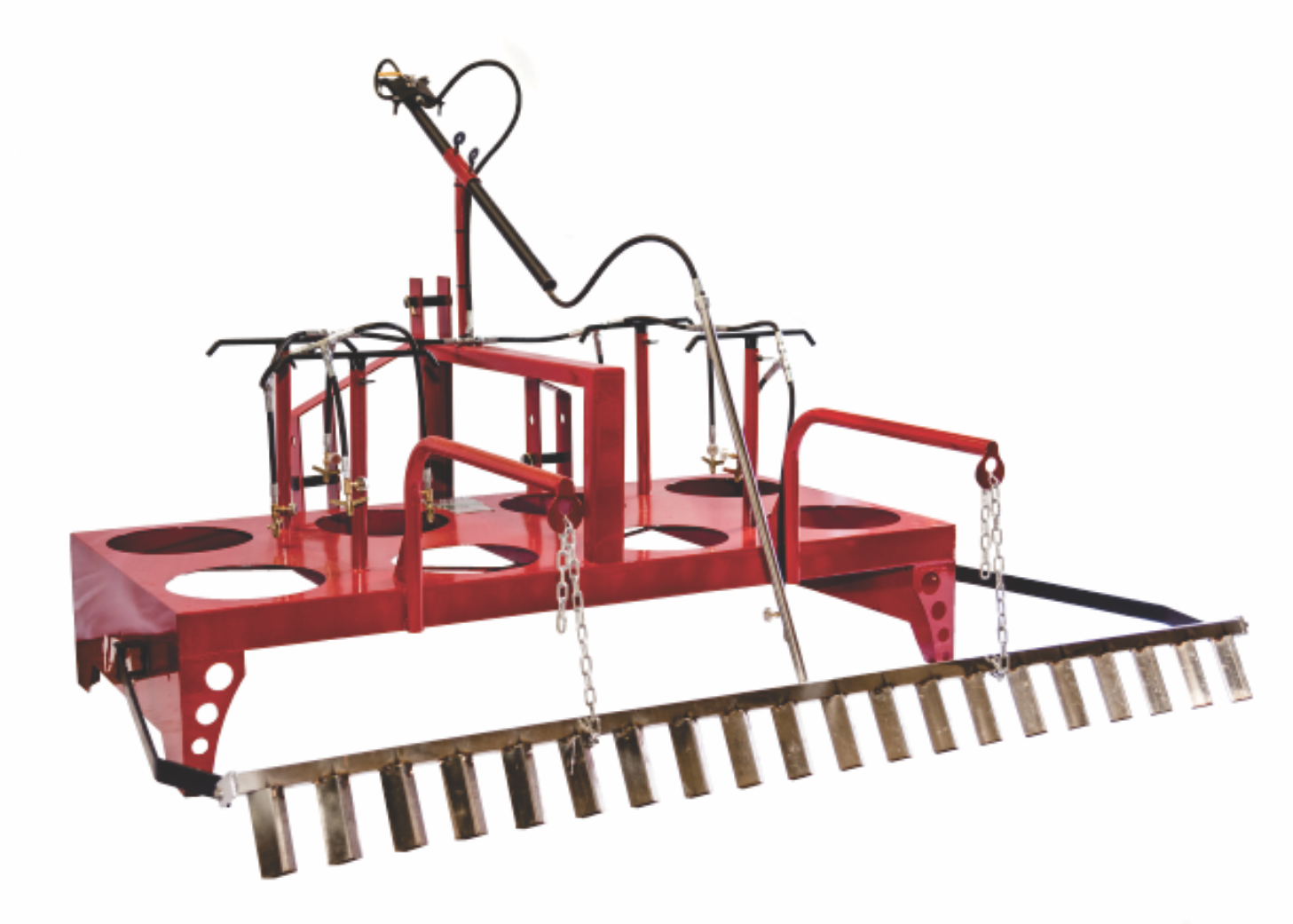 20 lança chamas com estrutura em aço inoxidável; - Tubo de distribuição de gás em inox; - Roda de apoio com regulagem de altura; - Largura de queima útil: 12 metros